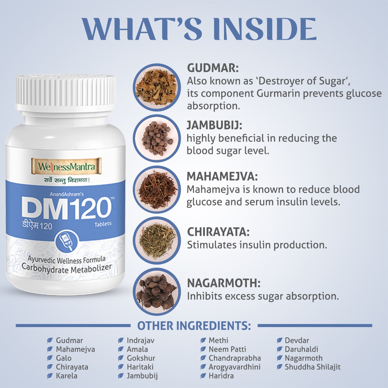 - PURE AND AUTHENTIC- AnandAshram’s DM 120 Tablets are ★ Tested for Heavy Metals ★ Made in India ★ 100% herbal active ingredients ★ Approved by Food and Drug Control Administration (FDCA).
