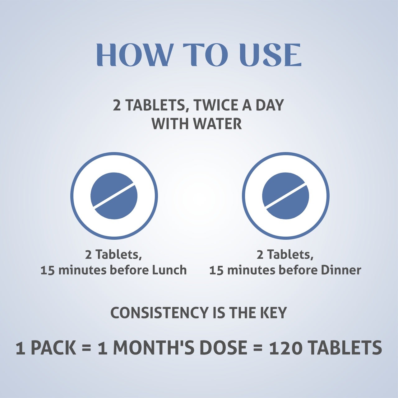 - Dosage: 2 tablets, 30 minutes before every meal (breakfast, lunch, dinner) or as directed by the Physician.